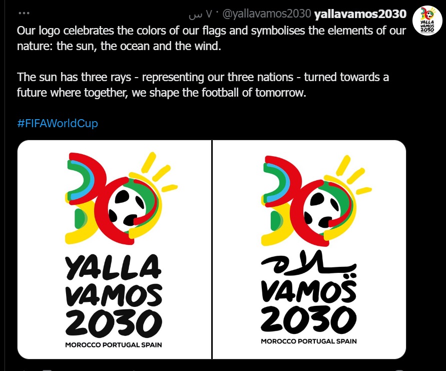 بهذا التعريف وصف الحساب الرسمي لملف التنظيم الثلاثي لكأس العالم 2030 ، على منصة X، الهوية البصرية لشعار كأس العالم والتي حملت عبارة "يالاه Vamos" بالعربية أخيرا.